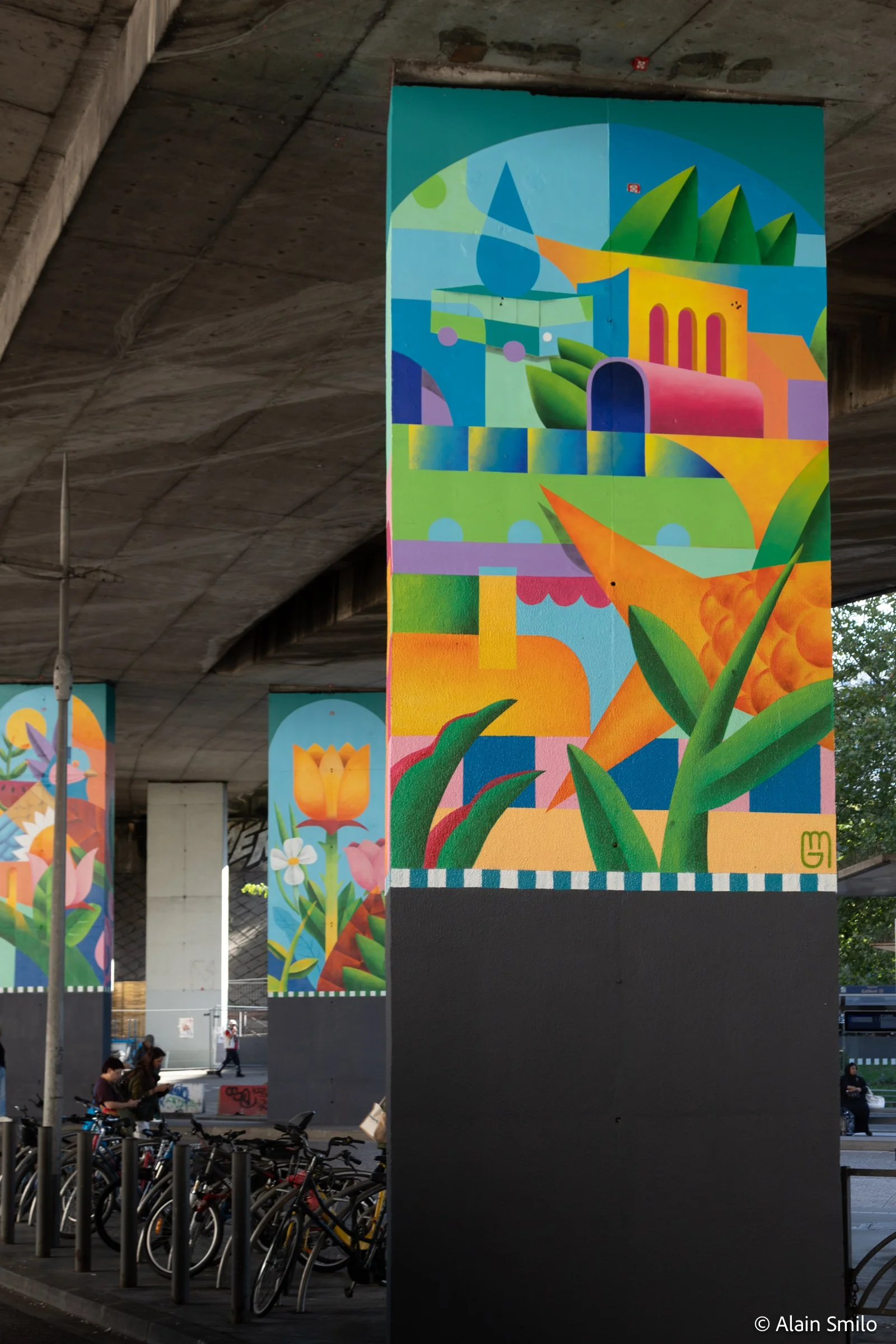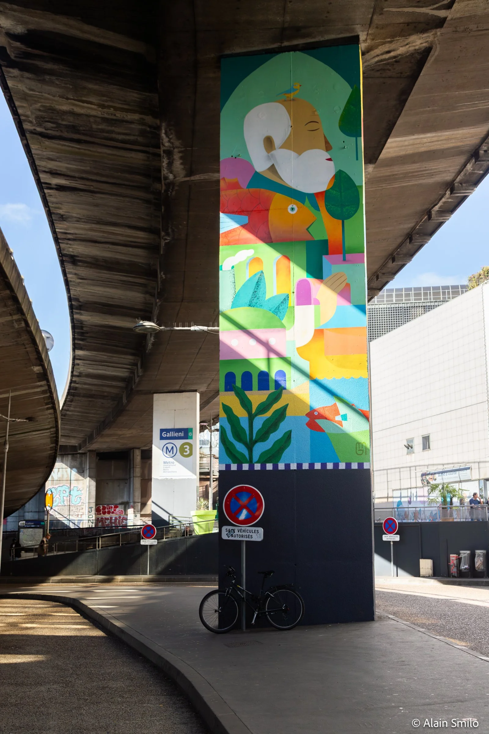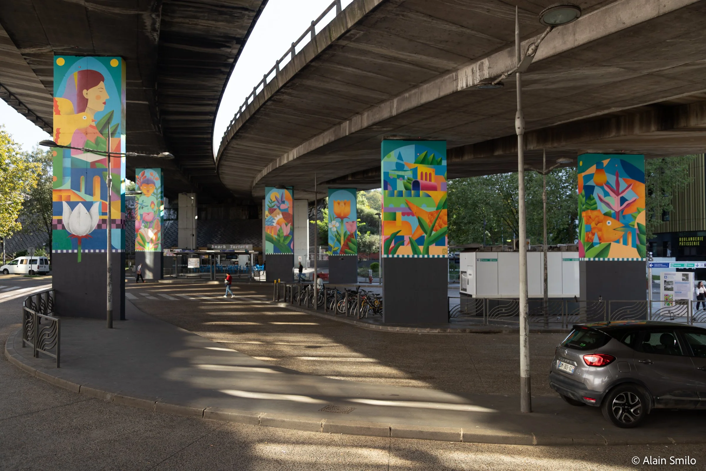 Pour accompagner cette transformation, le collectif d'artistes Douze Douze basé à Bagnolet a imaginé et peint plusieurs fresques sur les piliers du viaduc de l'autoroute A3 et autour de l'échangeur. Telles des vitraux d'une cathédrale faite de béton, elles colorent un lieu jusque-là perçu comme hostile, en proposant des images qui vous invitent à regarder autrement le quartier dans lequel vous vivez ou que vous traversez.